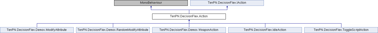 Implemented in TenPN.DecisionFlex.Demos.ModifyAttribute, TenPN.DecisionFlex.Demos.RandomModifyAttribute, TenPN.DecisionFlex.Demos.WeaponAction, TenPN.DecisionFlex.ToggleScriptAction, and TenPN.DecisionFlex.IdleAction.